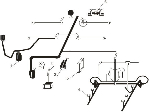 1 – доильный аппарат; 2 – вакуумпровод; 3 – тележка для перевозки фляг; 4 – устройство промывки; 5 – шкаф запасных частей; 6 – клапан спуска конденсата.